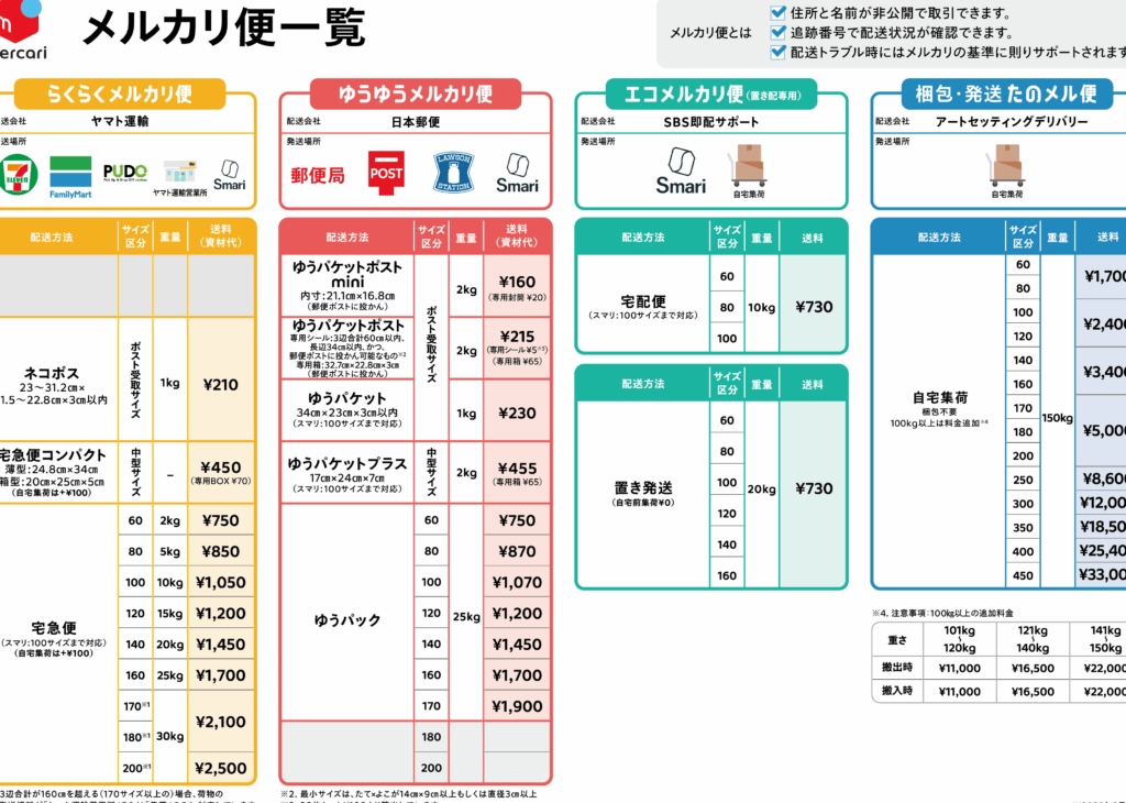らくらくメルカリ便の料金体系は、サイズによって異なる明確な基本料金が設定されています。このサービスは、全国のコンビニエンスストアや宅配便業者で手軽に利用でき、利用者にとって便利です。以下に各サイズの基本料金を示します。