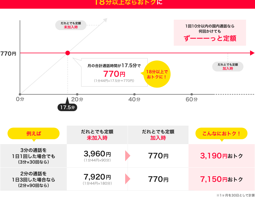 | au | 1分あたり20円 | 月額1,700円で無制限 |