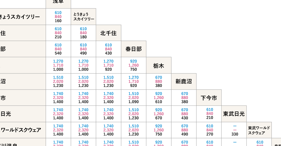 | 浅草 – 宇都宮 | 約2,520-4,000 |