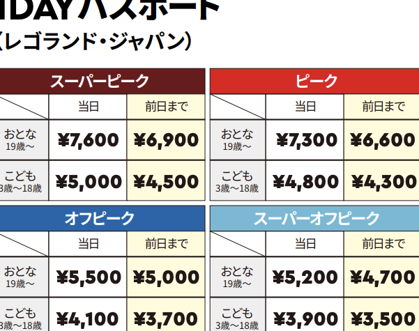 愛知県のレゴランドでは、訪問者の年齢に応じた異なる料金設定があります。ここでは、大人と子供の料金、さらに割引と特典について詳しく説明します。