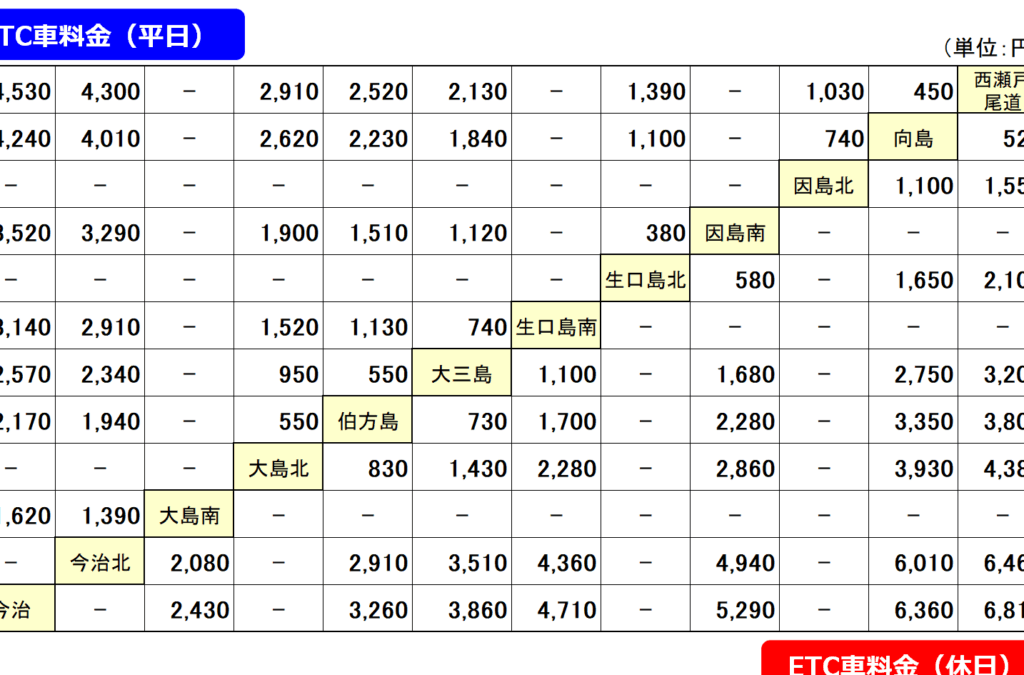 しまなみ海道の料金は車両の種類によって異なります。以下に車両別料金の詳細を示します。