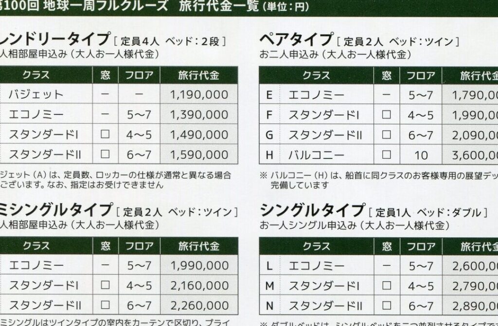 料金については、基本料金とオプション料金が含まれます。基本料金は旅行者の選択により異なります。出発地やキャビンタイプ、早期予約割引によって、料金は70万円から180万円の範囲に設定されています。具体的な価格は公式サイトで確認することが重要です。