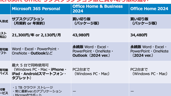- Microsoft 365 Personal: 月額約1,100円からの料金で、1ユーザー向け。1TBのOneDriveストレージを利用でき、常に最新のエクセルバージョンにアクセス可能。