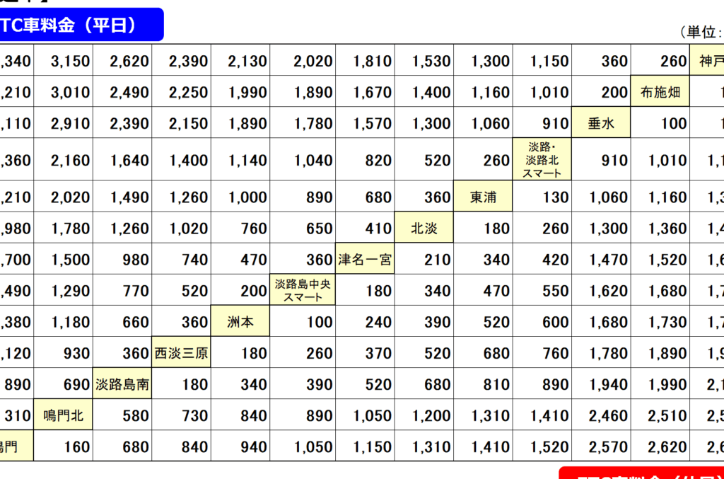 淡路自動車道を利用する際の料金は以下の通り技術的に設定されている。