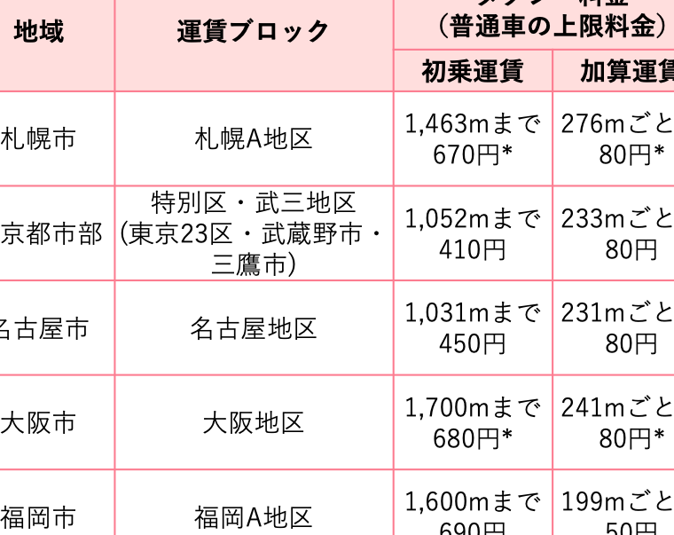 | 地域 | 初乗り運賃 | 1キロ単価 | 6キロ料金 |