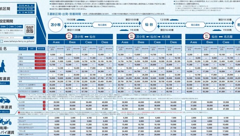 仙台から苫小牧までのフェリー料金は季節や予約状況によって変動しますが事前に情報を把握することで計画がスムーズに進みます。大人料金は8,000円から15,000円程度で子供料金はその半額です。車両運搬料金も車のサイズによって異なるため注意が必要です。