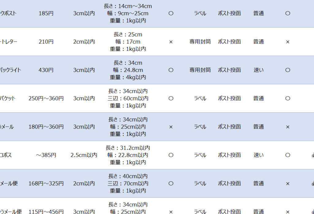 各サイズごとに料金が異なるため、発送する荷物の重量に注意が必要です。