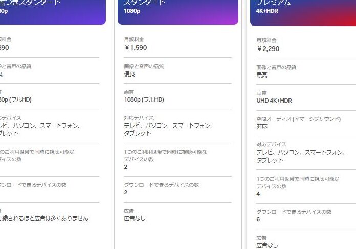 - プレミアムプラン: 月額1,980円。4K画質での視聴が可能で、同時に4台のデバイスで視聴できます。このプランは、特に高画質を求めるユーザーに便利です。