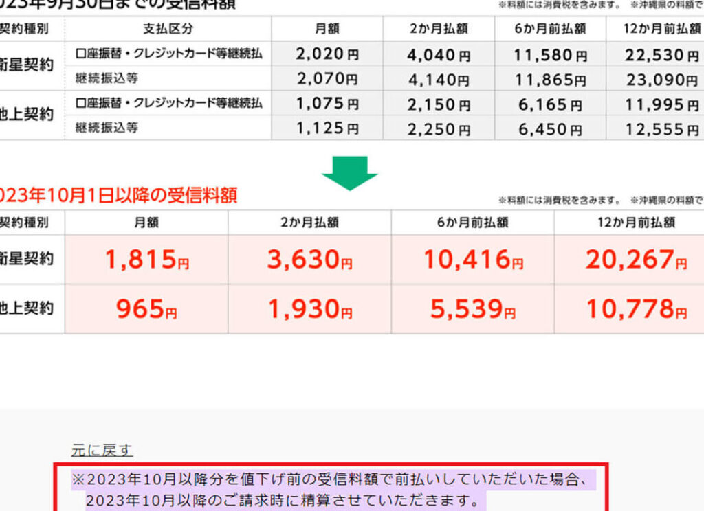 - 2014年: 地上波契約が月額1,320円、衛星波契約が月額2,110円となり、現在に至る。