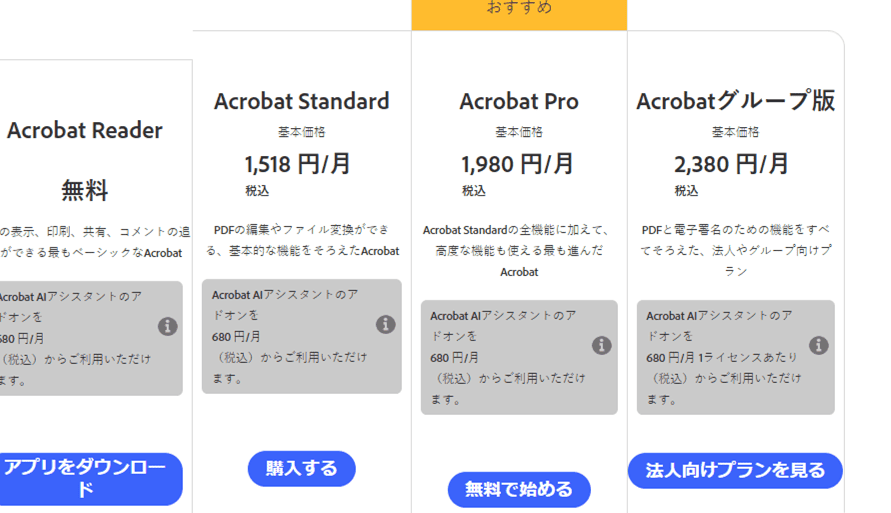 Acrobat Readerには、複数の有料版があります。選択肢は以下の通りです。