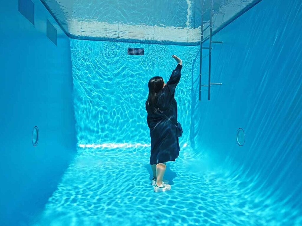 プールはその透明度と青い色合いで、見る者を魅了します。水面に映る周囲の景色や、光の反射が人々を惹きつけます。また、プールの水深は約1.5メートルで、視覚的なインパクトだけでなく、体験としての楽しさも提供します。ルーブル美術館のような著名な美術館とは異なる、新しいアート体験を価値あるものにしています。