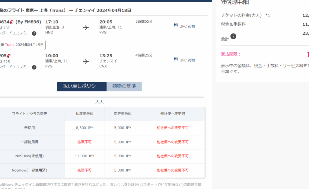 私たちの旅行時に、中国東方航空の荷物の超過料金についての体験が非常に参考になった。具体的には、エコノミークラスの旅行者が、最初の30kgを超える荷物に対して¥2,000/kgの料金がかかることに驚いた。友人が特に手荷物を追加したため、最初から荷物の調整をしておけば良かったと話していた。