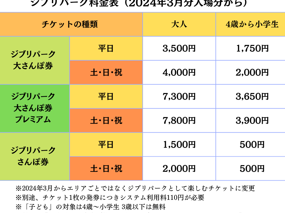 ジブリパークの各エリアの入場料金は、エリアによって異なりません。すべてのエリアで大人(12歳以上)が2100円、子供(4〜11歳)が1000円、そして3歳以下の子供は無料です。ただし、特定の日時には事前予約が必要な場合があり、混雑時や特別イベント時に料金が変更されることがあります。