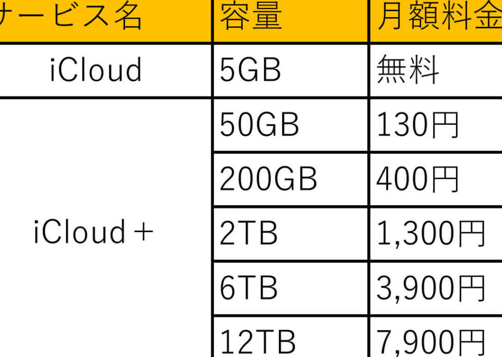 | iCloud | 5GB | 130円 (税込み) | 400円 (税込み) | 1,300円 (税込み) |