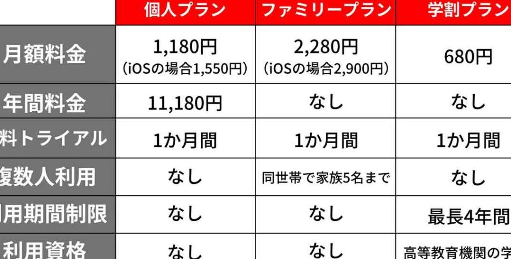 - YouTube Premium: 月額1,180円(税込)で、広告が非表示、オフライン再生機能があります。