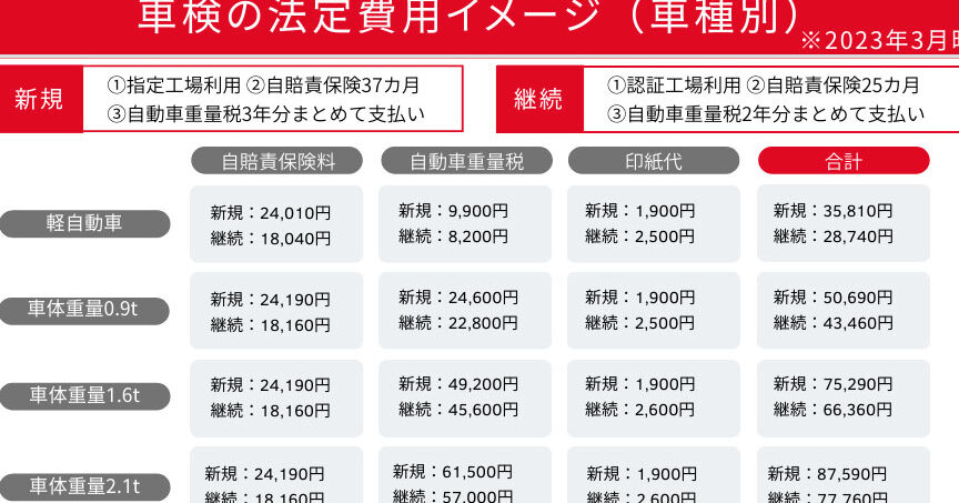 普通車は年式や状態によって料金が変動し、特に古い車両では維持費が増加することがあります。また、軽自動車の場合は維持費が比較的安いため、コストパフォーマンスが良いとされています。具体的な費用は、整備や検査手数料、税金が含まれています。信頼できる業者を選ぶことで、適正価格を提示されることが期待できます。