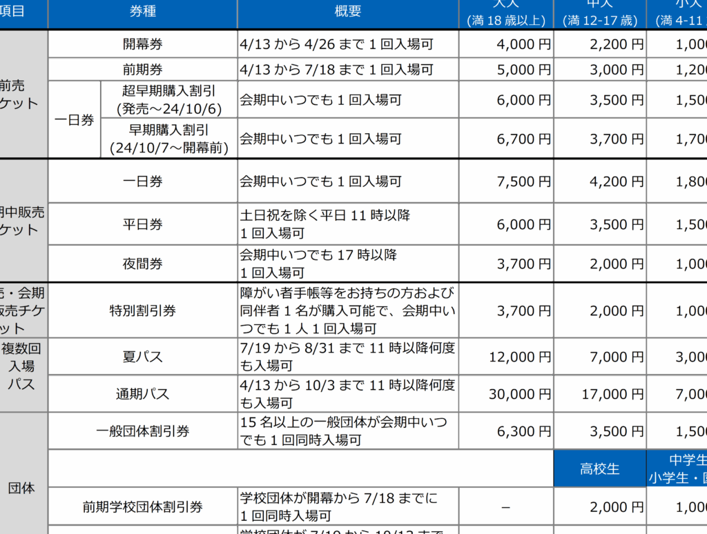 一般チケットは、入場に必要な基本的なチケットです。一般チケットの価格は、4,000円から6,000円の範囲と予想されています。 大人は5,000円程度を目安にするのが一般的です。なお、子どもや高齢者には割引が適用される可能性があります。このチケットでの入場により、すべてのエリアを楽しむことが可能です。もし団体での訪問を考えている場合、団体割引も利用できるため、最大20%の料金が割引されることがあります。