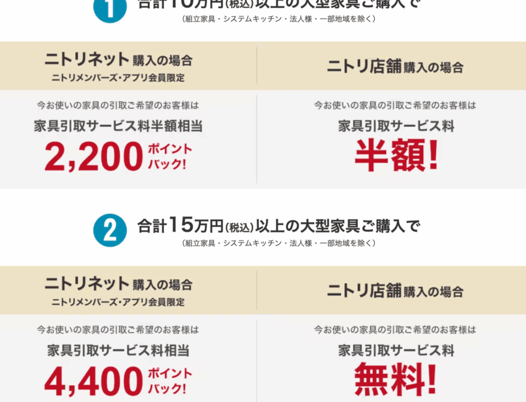 ニトリでは、引き取りに関連するキャンペーンや割引情報が随時更新されます。これにより、引き取り料金が通常よりも安くなる場合があります。具体的な例を挙げると: