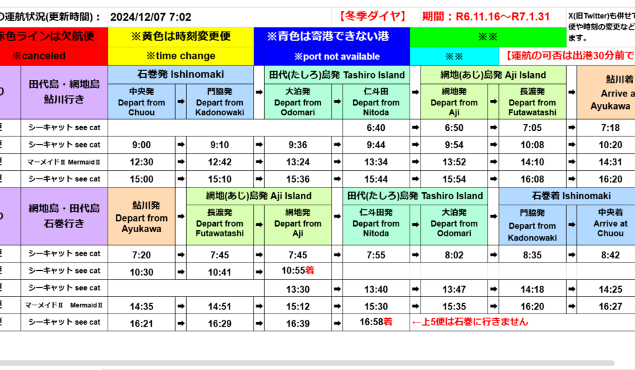 田代島へのアクセスには複数のフェリー会社利用が可能です。主要フェリー会社は以下の通りです。