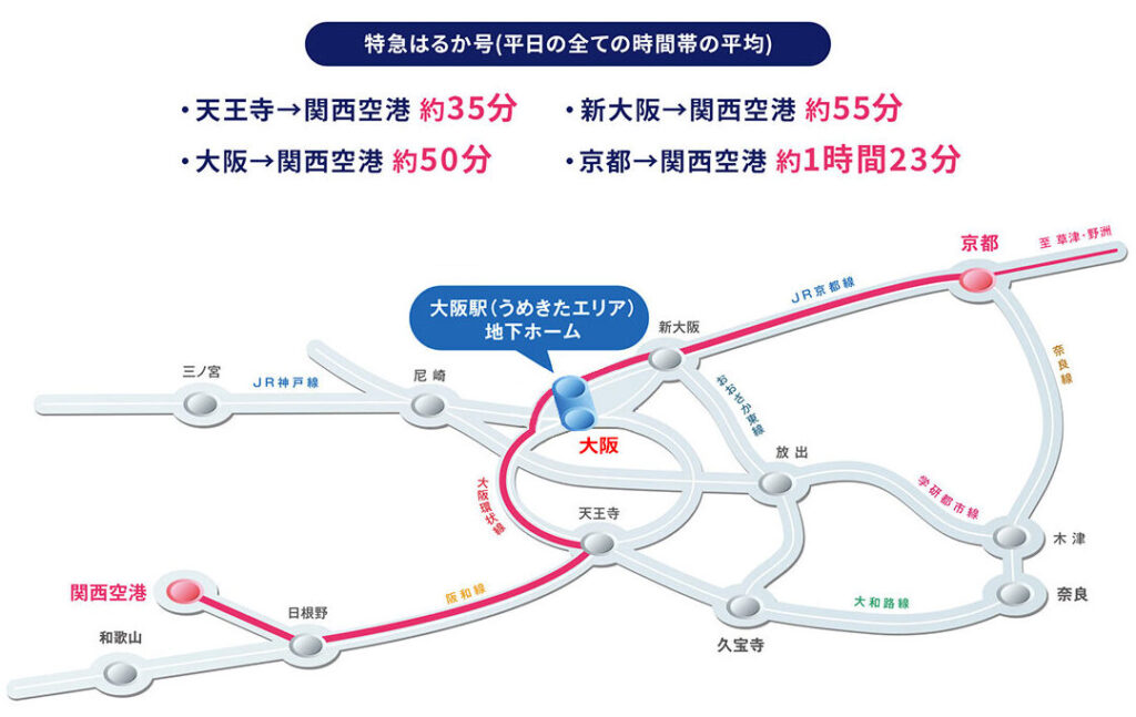- ひかり: 新大阪と関空を結ぶ主要な快速列車で、所要時間は約30分です。