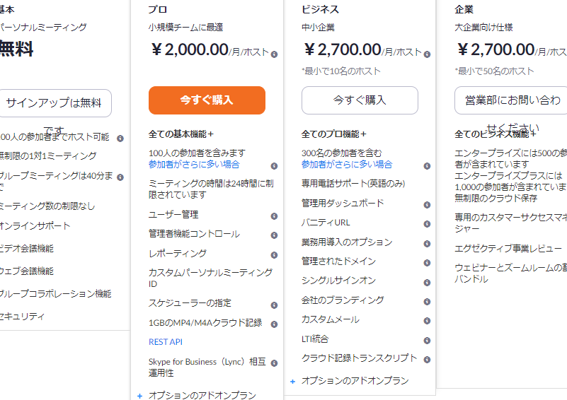 ズームには複数のプランがあり、それぞれに異なる特徴があります。以下に各プランの概要を示します。