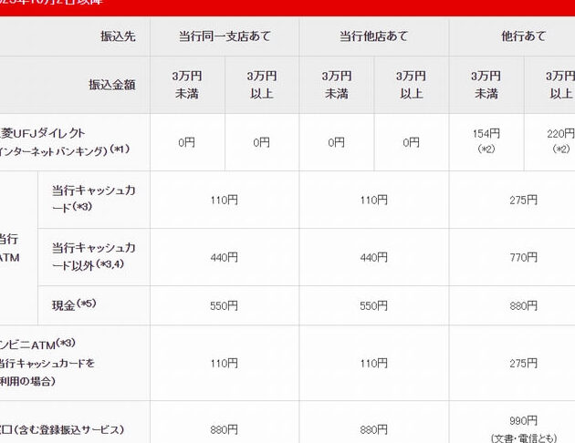 三菱UFJ銀行のATMにおける振込手数料は、他行と比較すると明確な違いがあります。例えば、一般的なコンビニATMを利用する場合、振込手数料は通常高めに設定されています。以下に具体的な手数料を示します。