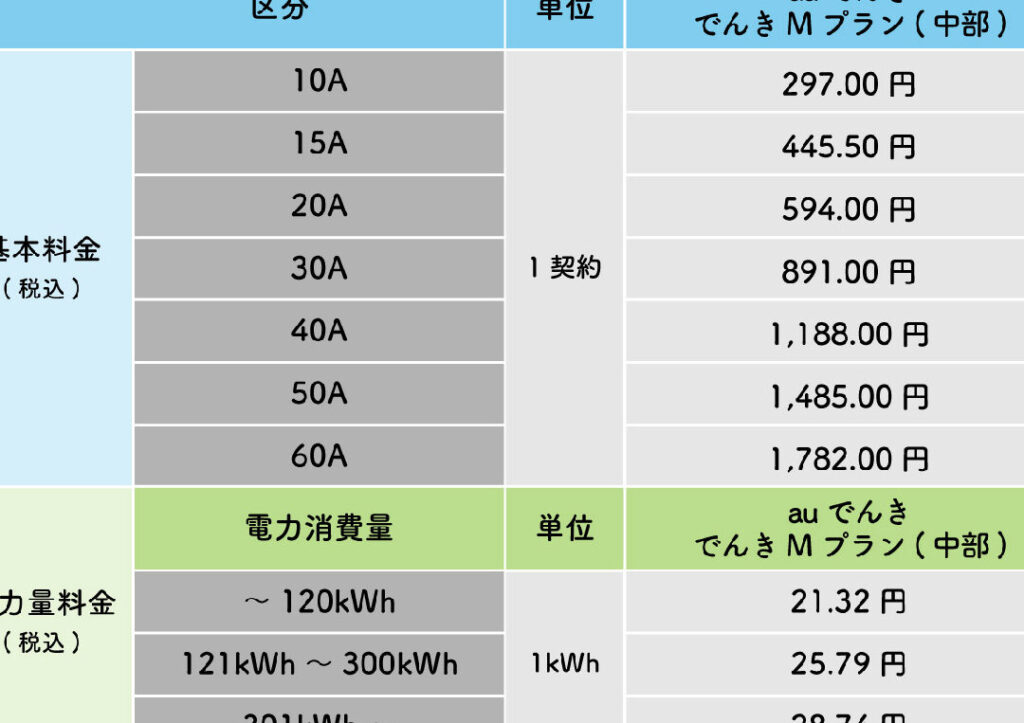 - 従量料金: au電気は1kWhあたり約22.5円、他社は約20円から30円。